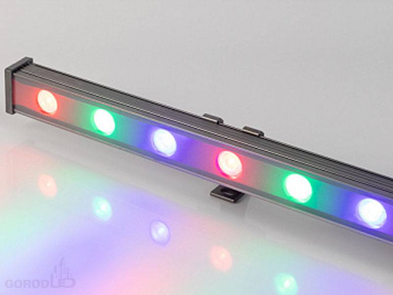 Ультратонкий линейный светодиодный прожектор. Мощность 18W, напряжение питания DC 24V. Светодиоды EPILED 18 штук. Цвет светодиодов RGB, управление по протоколу DMX512, угол рассеивания 30°. Корпус: алюминиевый сплав и армированное стекло. Цвет корпуса серый, степень влагозащиты IP65. Габариты 1000x40x30мм.