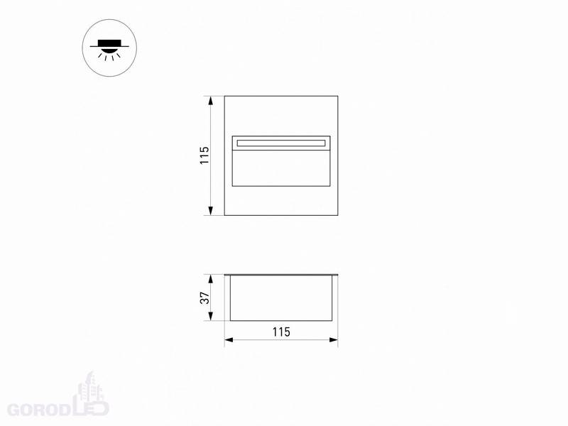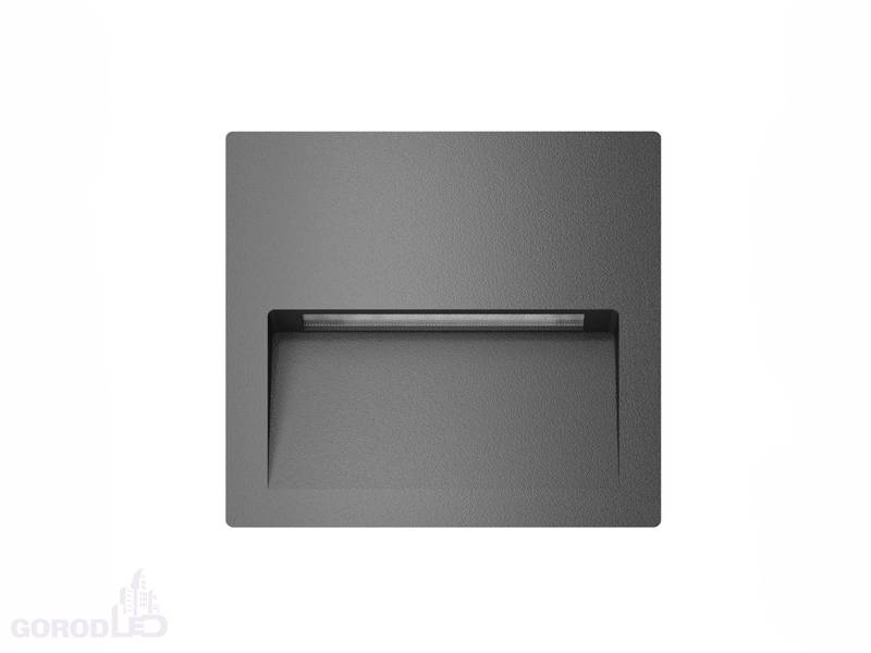 Светодиодный встраиваемый квадратный светильник для стен, лестниц, 4Вт. Цвет Теплый белый 3000K, св.поток 220лм, CRI(Ra)>80, угол 70°, асимметричный свет. Размер 115x115x37мм. Влагозащищенный корпус IP65, алюминий серого цвета. Питание AC220-240V, 4Вт, встроенный драйвер.