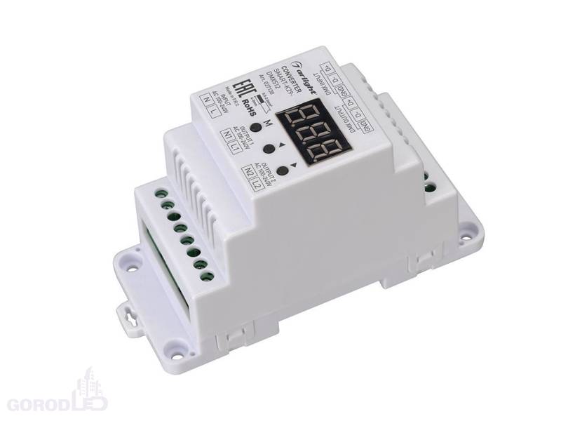 Конвертер сигнала DMX512 в TRIAC. Вход - DMX512, выход TRIAC(230V), напряжение питания AC 230V. 2 канала управления, ток нагрузки 2х1.2А. На корпусе цифровой дисплей. Габариты 110 x 48 x 67 мм. Для использования на DIN-рейке.