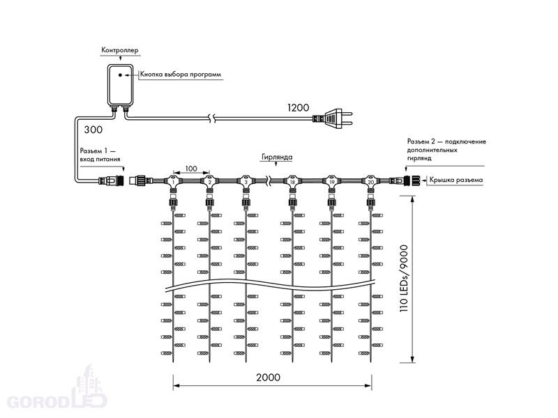Светодиодная гирлянда "Занавес" серии Classic. Размер 2000*9000 мм (длина 2000 мм, высота 9000 мм). Материал провода - прозрачный ПВХ. Диаметр провода 2.3 мм. 20 нитей длиной 9000 мм, ниспадающих вниз. Количество светодиодов 2200 шт, 110 на каждой нити. Размер светодиодов 5 мм с защитным колпачком с вогнутой внутрь линзой. Напряжение питания AC 230V, потребляемая мощность 120W. Гирлянда укомплектована контроллером для смены режимов свечения и сетевой вилкой. Всего 8 встроенных динамических режимов. Степень защиты от воздействия окружающей среды IP44. Температурный режим работы от -30 градусов до +40 градусов по Цельсию. Предусмотрена возможность соединения до 3 гирлянд между собой без дополнительных аксессуаров.