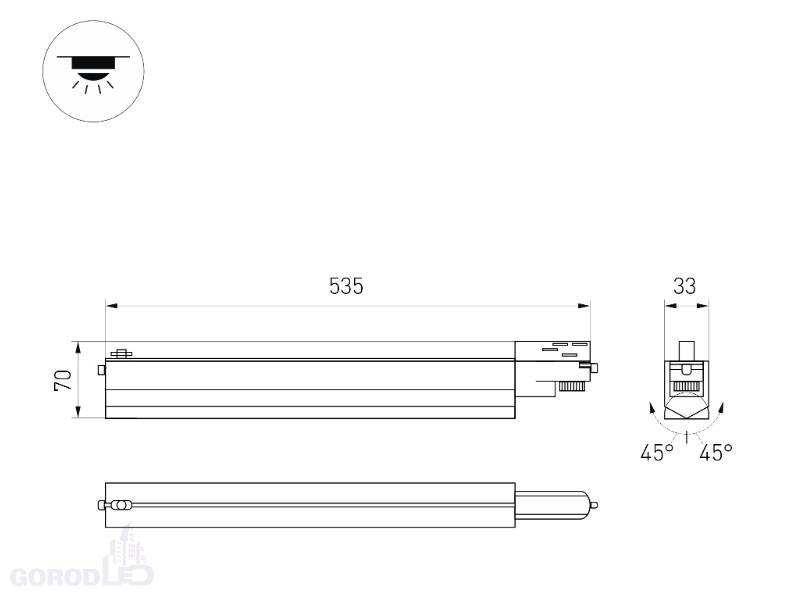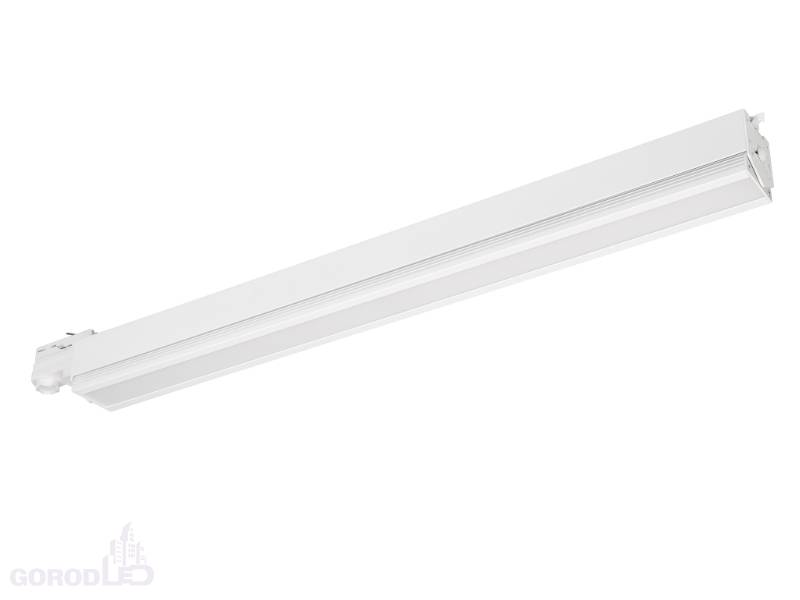 Светильник подвесной для треков/шин 4 провода. Угол поворота светильника 90° (45°+45°). Мощность 20 Вт, св. поток 1600 лм, световая отдача 80 лм/Вт, теплый 3000 K, дневной 4000 К, CRI>90, угол 100°, напряжение питания 230 В. Черный или белый корпус из алюминия, материал рассеивателя PC, степень защиты IP20. Размер: длина 535 мм, ширина 33 мм, высота 70 мм. Монтаж на трек 3-фазный. Драйвер встроенный, пульсация <1%.