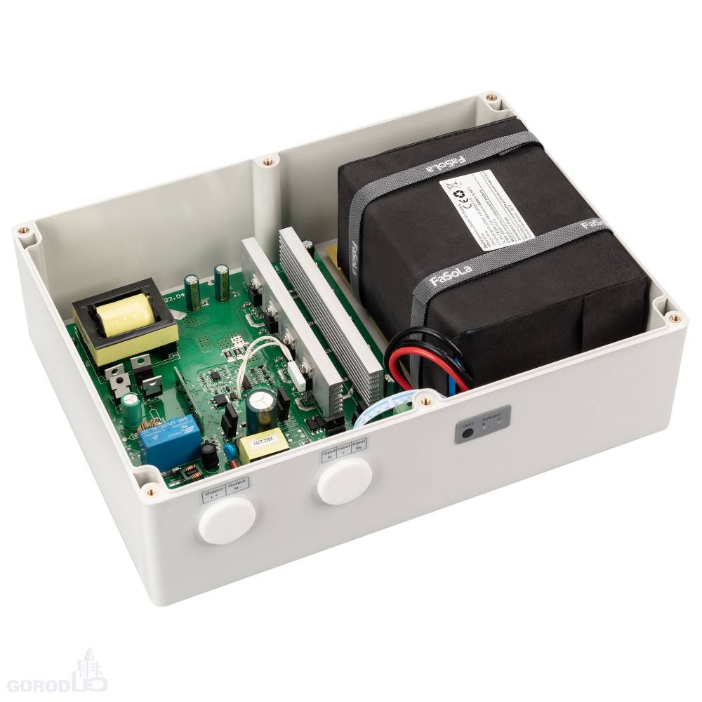 Блок аварийного питания с гальванической развязкой для светильников и мощных светодиодов. Входное напряжение 220-240 VAC. Выходное напряжение: 230-300 VDC (подстраивается под блок питания). Допустимая мощность нагрузки: 170Вт. Встроенный PFC >0.95. Герметичный пластиковый корпус со встроенной аккумуляторной батареей LiFePO4 IP 65. Емкость батареи 18000 мА/ч, напряжение 19.2В, мощность заряда батареи 200Вт, время работы от АКБ до 1 ч в зависимости от нагрузки. Габаритные размеры блока питания длина 290 мм, ширина 210 мм, высота 100мм. Гарантийный срок 3 года.