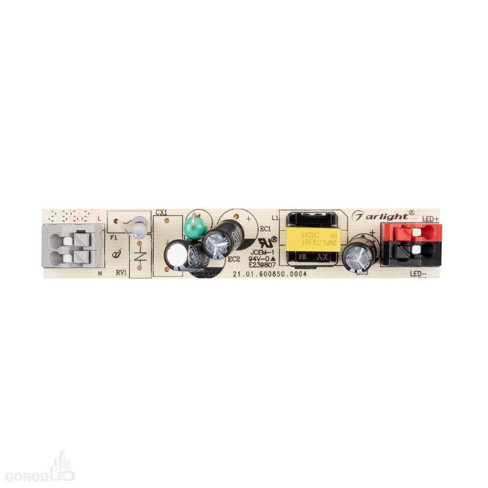 Открытый источник тока без гальванической развязки для светильников и мощных светодиодов. Входное напряжение 220-240 VAC. Выходные параметры: 70-88 В, 240 mА, 21 Вт, PF >0.5. Бескорпусное исполнение IP 00. Габаритные размеры длина 82 мм, ширина 14.5 мм, высота 17.3 мм.