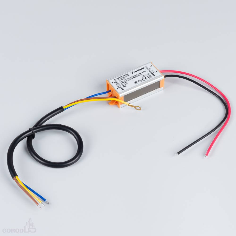 Источник тока с гальванической развязкой для уличных светильников и мощных светодиодов. Входное напряжение 100-240 VAC. Выходные параметры: 12-24 В, 500 mА, 12 Вт. PF >0.5. Герметичный металлический корпус IP 65. Габаритные размеры длина 68 мм, ширина 30 мм, высота 20 мм. Гарантийный срок 3 года.