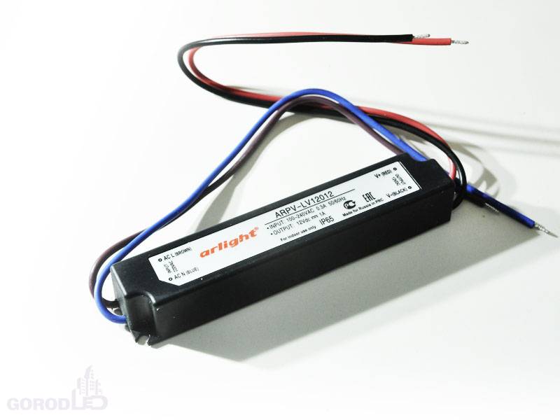 Импульсный источник питания имеет степень герметизации IP65 и предназначен для применения в помещениях с повышенным уровнем влажности или на улице. Блок защищен пластиковым корпусом, который так же способствует отведению тепла от рабочих деталей блока. Подсоединение осуществляется через специальные провода, выведенные на лицевую поверхность источника питания.