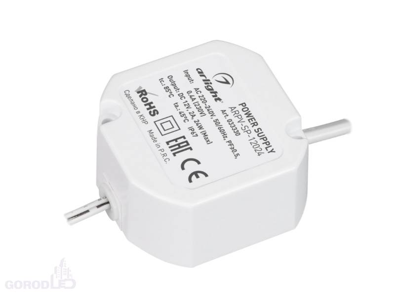 Источник напряжения с гальванической развязкой для светодиодных изделий. Входное напряжение 220-240 VAC. Выходные параметры: 12 В, 2 А, 24 В, 1 А, 24 Вт, PF >0.5. Герметичный пластиковый корпус IP 67. Рабочая температура -20…+45C⁰. Габаритные размеры длина 50 мм, ширина 50 мм, высота 25 мм. Гарантийный срок 5 лет.