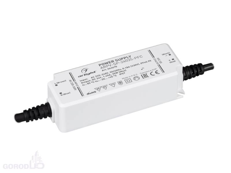 Источник напряжения с гальванической развязкой для светодиодных изделий. Входное напряжение 220-240 VAC. Выходные параметры: 24 В, 1,45 А, 35Вт. Встроенный PFC >0.95. Герметичный пластиковый корпус IP 67. Рабочая температура -20…+45C⁰. Габаритные размеры длина 110 мм, ширина 40 мм, высота 30 мм. Гарантийный срок 5 лет.