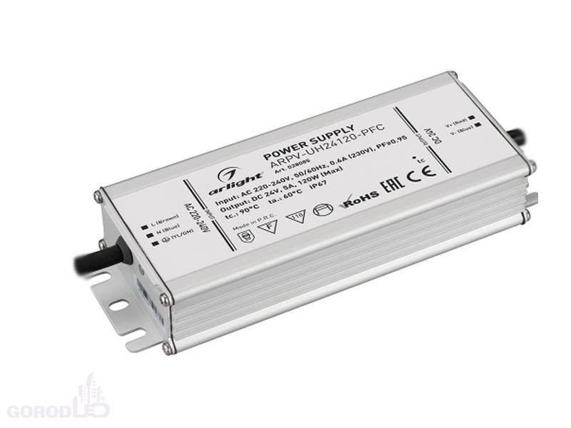 Блок питания для светодиодных лент, корпус металл IP67, мощность 120 Вт; Входное напряжение 220-240V; PF>0,95; Совместимость со стандартом EMC. Размер 131x67,5x38,5 мм. Гарантия 7 лет.