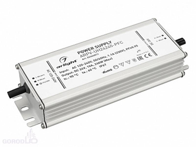 Выходные параметры: 24 В, 10 А, 240 Вт. Встроенный PFC >0.95. Герметичный алюминиевый корпус IP 67.