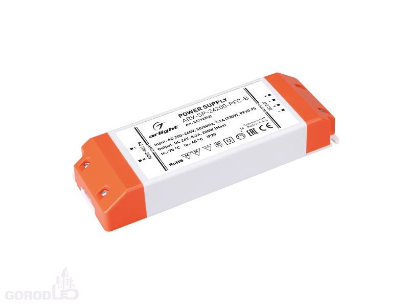 Источник напряжения с гальванической развязкой для светодиодных изделий. Входное напряжение 200-240 VAC. Выходные параметры: 24 В, 8.3 А, 200 Вт. Встроенный PFC >0.95. Негерметичный пластиковый корпус IP 20. Габаритные размеры длина 195 мм, ширина 67 мм, высота 31 мм.