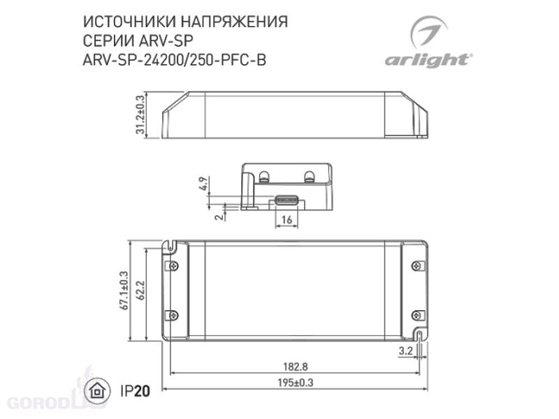 Источник напряжения с гальванической развязкой для светодиодных изделий. Входное напряжение 200-240 VAC. Выходные параметры: 24 В, 10.4 А, 250 Вт. Встроенный PFC >0.95. Негерметичный пластиковый корпус IP 20. Габаритные размеры длина 195 мм, ширина 67 мм, высота 31 мм.