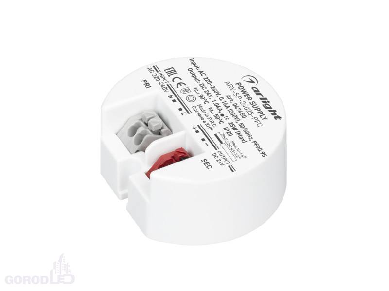 Источник напряжения с гальванической развязкой для светодиодных изделий. Входное напряжение 220-240 VAC. Выходные параметры: 24 В, 1.04 А, 25 Вт. Встроенный PFC >0.95. Негерметичный пластиковый корпус IP 20. Габаритные размеры диаметр в окружности Ø55 мм., высота 25 мм. Гарантийный срок 5 лет.