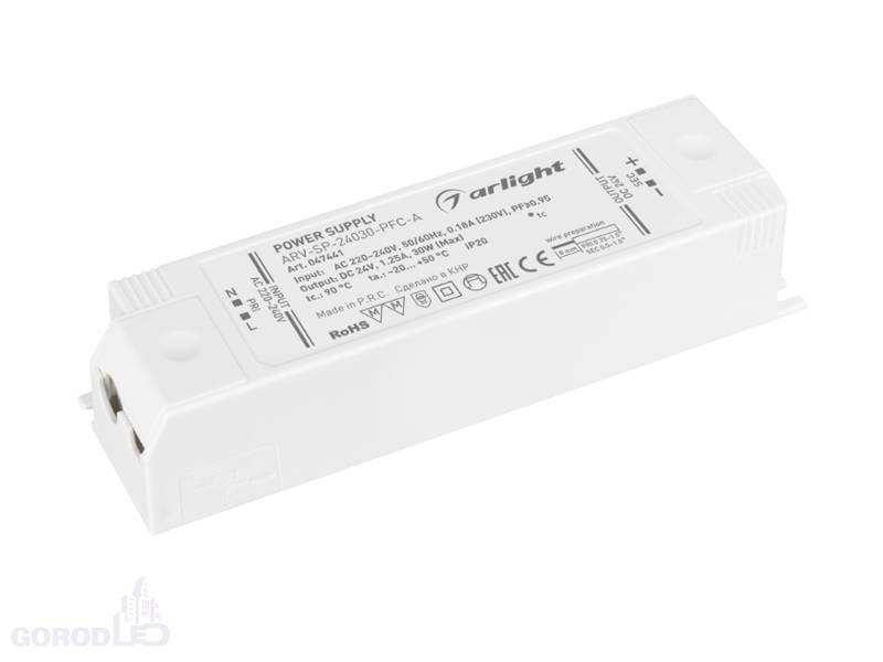 Источник напряжения с гальванической развязкой для светодиодных изделий. Входное напряжение 220-240 VAC. Выходные параметры: 24 В 1.25 А, максимальная мощность 30 Вт. Встроенный PFC >0.95. Негерметичный пластиковый корпус IP 20. Габаритные размеры длина 135 мм, ширина 36 мм, высота 25 мм. Гарантийный срок 5 лет.