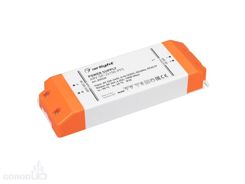 Источник напряжения с гальванической развязкой для светодиодных изделий. Входное напряжение 220-240 VAC. Выходные параметры: 24 В, 6.25 А, 150 Вт. Встроенный PFC >0.97. Негерметичный пластиковый корпус IP 20. Габаритные размеры длина 179,4 мм, ширина 62,5 мм, высота 30,6 мм. Гарантийный срок 5 лет.