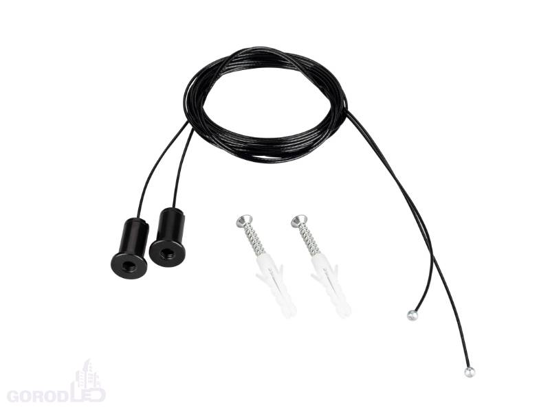 Подвесное крепление черного цвета для профилей ROUND-D36-360. Два регулируемых троса длиной 2 метра. Используя необходимое количество тросов (в зависимости от формы и длины светильника) можно легко зафиксировать конструкцию на необходимом расстоянии от потолка.