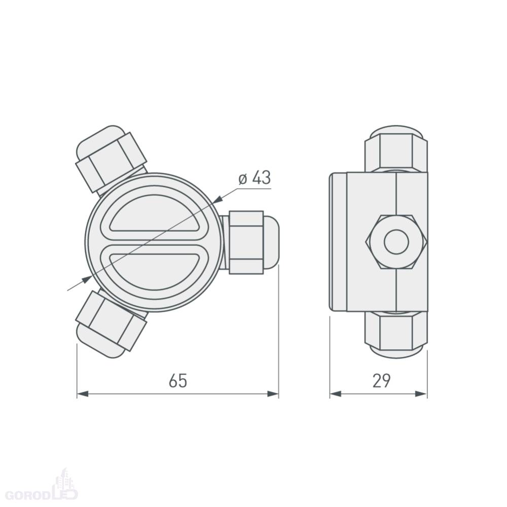 Разветвительная герметичная IP67 муфта на 3 кабеля, с изоляцией, круглого сечения диаметром 4-10 мм. Рекомендуемое напряжение 12-24В.