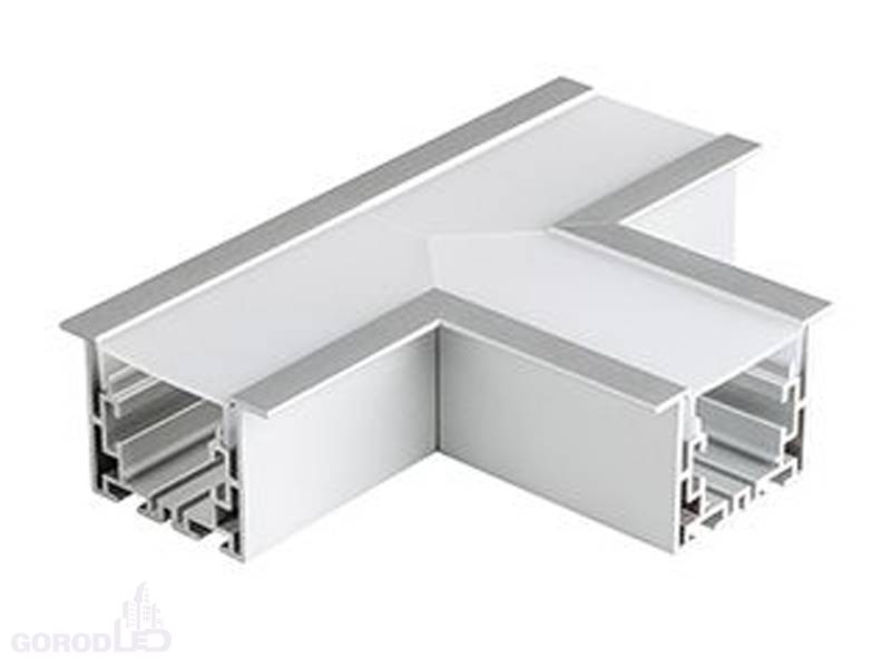 Тройной угол в сборе, для соединения 3-х профилей S2-LINIA55-F под прямыми углами 90°. Экран образует линию "Т" на плоскости. В комплекте матовый экран, соединители. Длина внешней стороны угла 150мм.