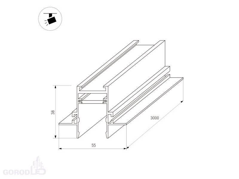 Размер: (ДxШxВ) 3000 x 55 x 38 мм. Размер (с учетом заглушек и фланцев) (ДxШxВ) 3003 x 55 x 38 мм. DC24V.