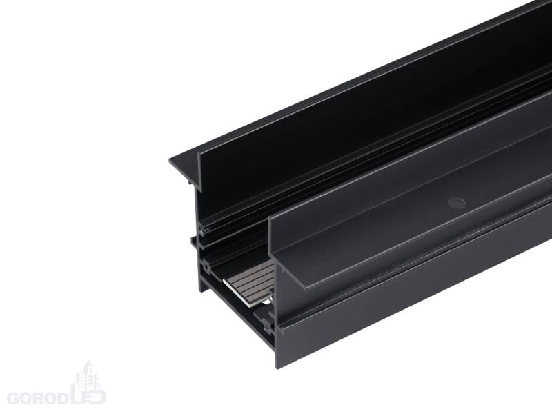 Встраиваемый магнитный трек с фланцем для монтажа в гипсокартонный потолок, длина 2000 мм. DC24V. Материал алюминий, цвет белый, черный. Две заглушки в комплекте. 5 токопроводящих дорожек (возможность управления по DALI). Размер ДxШxВ: 2000x75x60 мм. Размер (с учетом заглушек и фланцев) ДxШxВ: 2040x75x60 мм. DC24V.