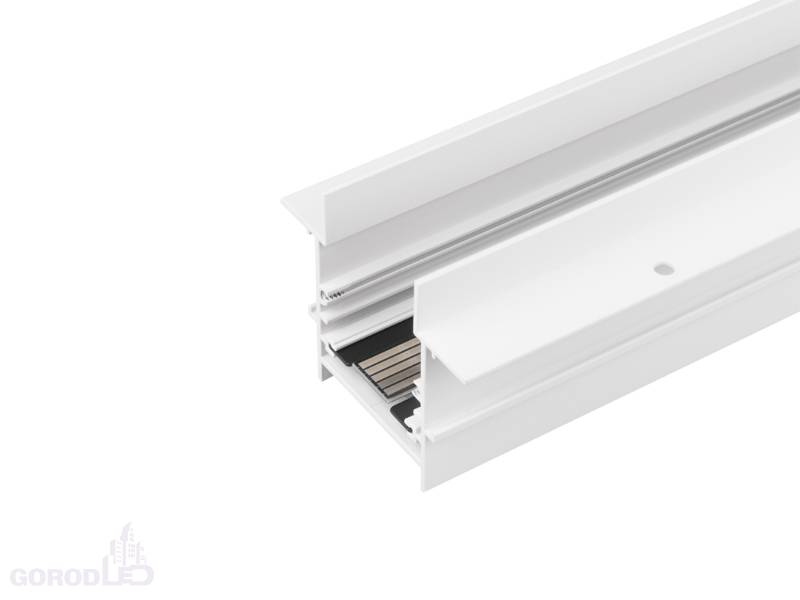 Встраиваемый магнитный трек с фланцем MAG-TRACK-4560-FDW-3000 (WH, 5LN) длиной 3000 мм предназначен для монтажа в гипсокартонный потолок. Две заглушки в комплекте. Размер (с учетом заглушек и фланцев) ДxШxВ: 2040x75x60 мм. Напряжение питания 24 В.