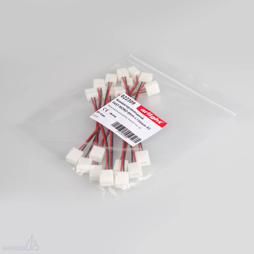 2 разъема с фиксаторами, на проводе 15см, для соединения 2-х отрезков светодиодных одноцветных лент шириной 8мм. Максимальный допустимый ток 3А.