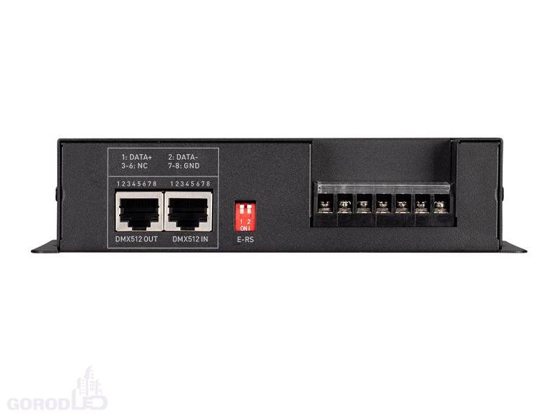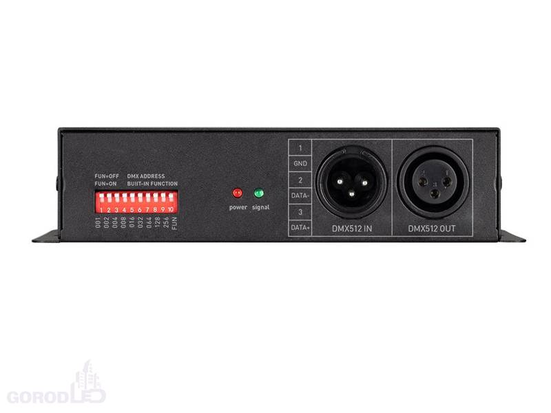 Декодер сигнала DMX512 в ШИМ (PWM). Напряжение питания DC 12-24V, 4 канала управления, ток нагрузки до 8А на канал, максимальная мощность 384-768W, разъём XLR3. Адреса устанавливаются DIP-переключателями на корпусе. Габариты 164х65х40 мм.