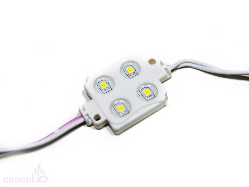 Пластиковый корпус, модуль на 4 светодиода smd 3528, св.поток 32-35 лм, питание 12В, мощность 0.72 Вт, угол 120°, IP65. Габариты 42х28х5.9 мм. 50 шт на проводе, длина провода между модулями 90мм.