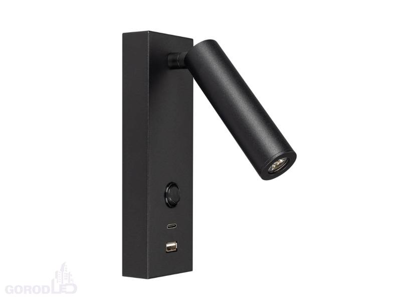 Накладной настенный светильник. Мощность 3 Вт, св. поток 200 лм, 65 лм/Вт, теплый 3000 K, CRI>80, угол 20°, напряжение питания 230 В. Черный прямоугольный корпус из алюминия, степень защиты IP20. Размер основания 60х180х25 мм. Размер светоизлучателя Ø30×110 мм. Монтаж накладной. Драйвер встроенный, пульсация <5%. Встроенный USB порт для зарядки (стандартный и Type-C).