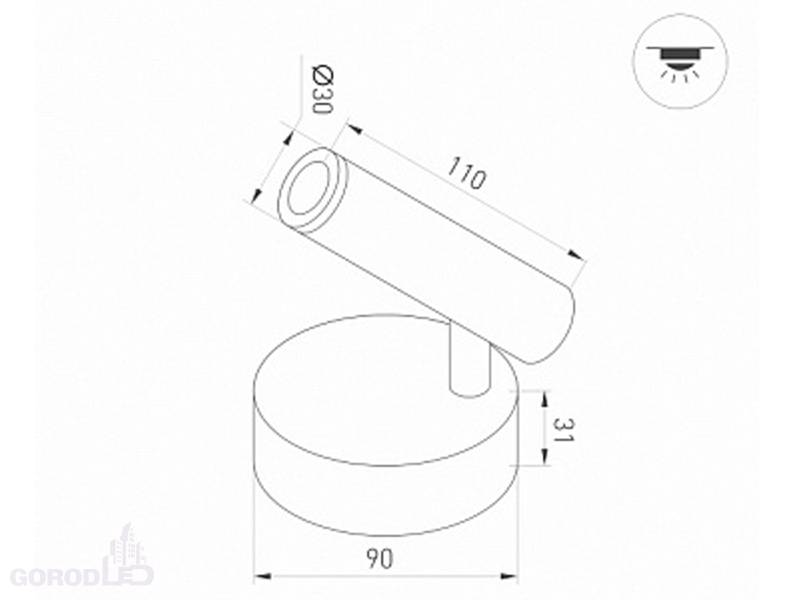 Размер: Ф90 x 31 мм, Светоизлучатель Ø30 × 110 мм. IP20. Питание AC220-240V, 3 Вт, встроенный драйвер.
