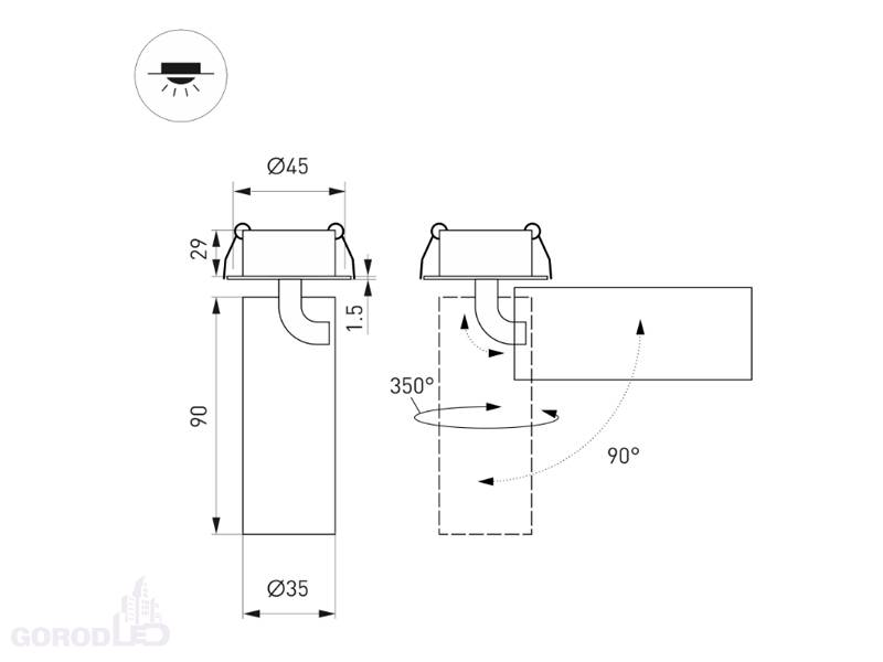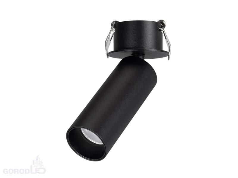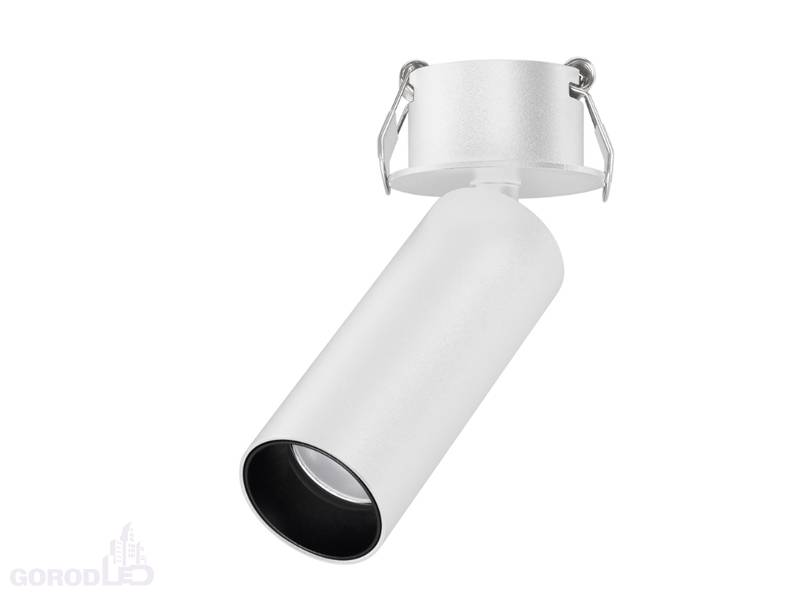 Светильник встраиваемый откидной. Мощность 7 Вт, св. поток 580 лм, 82 лм/Вт, дневной 4000 K, теплый 3000 К, CRI>90, угол 36°, напряжение питания 230 В. Черный или белый круглый корпус из алюминия, экран PMMA, степень защиты IP40. Размер: диаметр 35 мм, высота светового модуля 90 мм, высота основания 1.5 мм. Угол поворота 350°, угол наклона 90°. Монтаж встраиваемый, установочное отверстие: диаметр 45 мм, глубина 29 мм. Драйвер в комплекте 30-40 В, 150 мA, пульсация <1%.