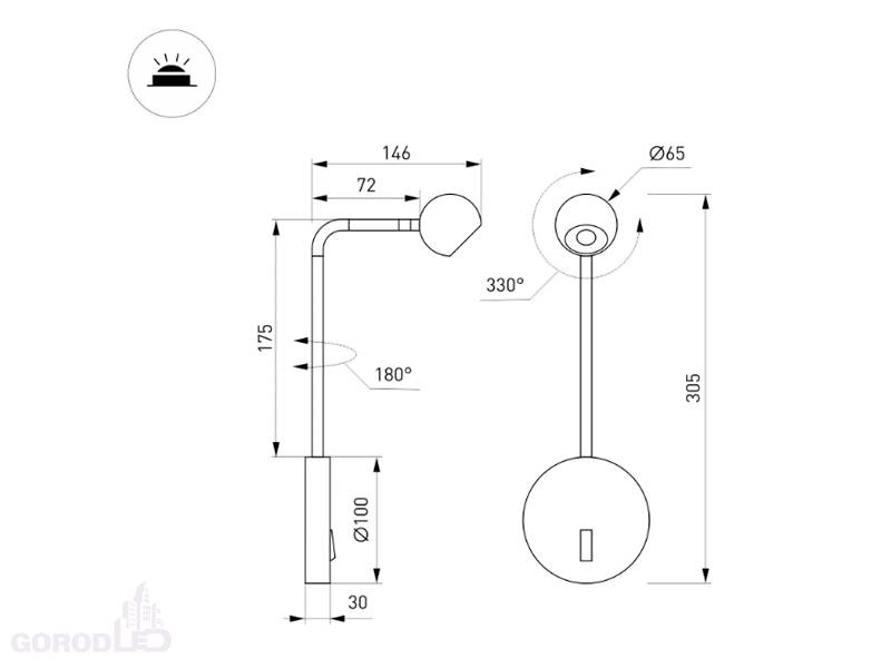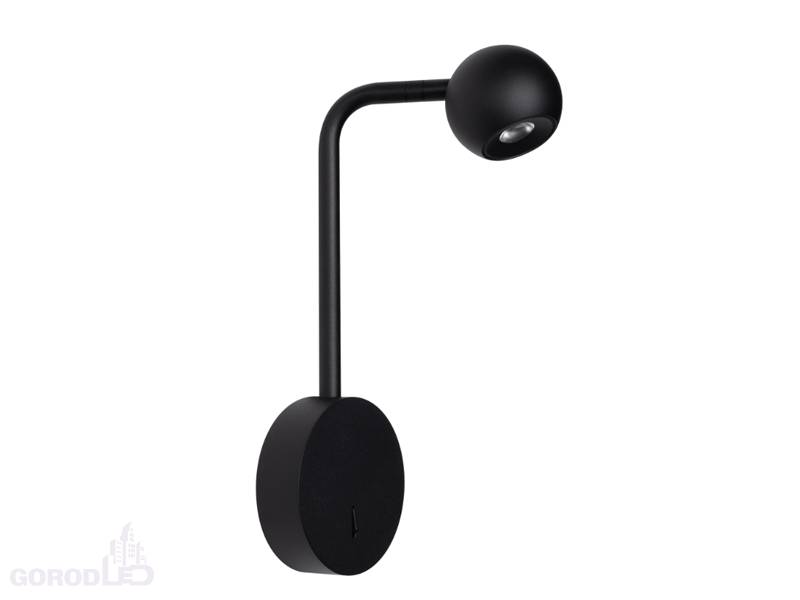 Накладной настенный светильник. Мощность 6 Вт, св. поток 540 лм, 90 лм/Вт, теплый 3000К, CRI>90, угол 30°, напряжение питания 230 В. Черный или белый корпус из алюминия (основание, ножка, светоизлучаль в форме шара), степень защиты IP20. Размер основания Ø100×30 мм, размер ножки Ø12,5×175х72 мм, размер светоизлучателя Ø65×55,5 мм. Драйвер встроенный, пульсация <1%