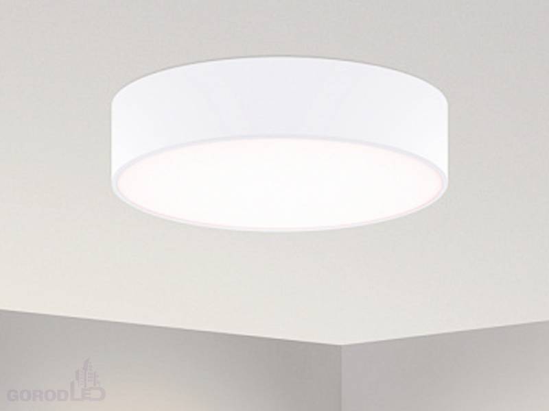 Белый круглый корпус из алюминия, степень защиты IP20.