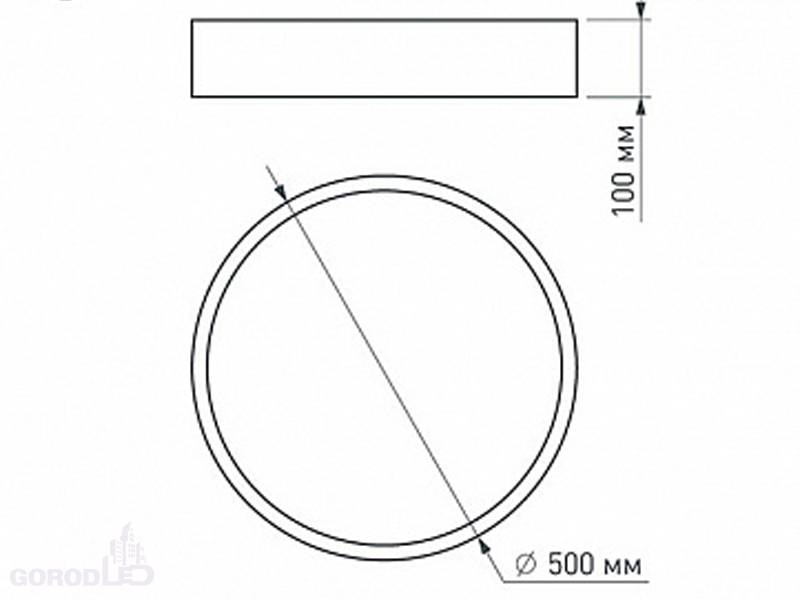 Размер: диаметр 500 мм, высота 100 мм. Монтаж накладной. Драйвер 30-42 В, 950 мА, пульсация <5%.