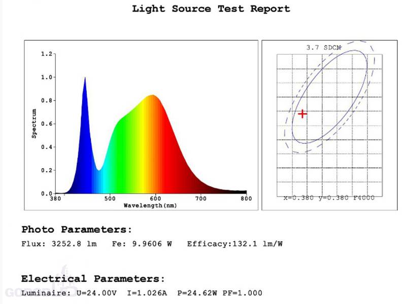 Ультрасовременные кристаллы, обладающие светоотдачей >140 Лм/Вт, позволили установить класс энергоэффективности А++. С учетом потерь на рассеивателе светильник выдает 100 Лм/Вт! Световой поток: Теплый белый 3000К, Дневной белый 4000К - 3200 Lm. Это лучший показатель для такого оборудования в мире.