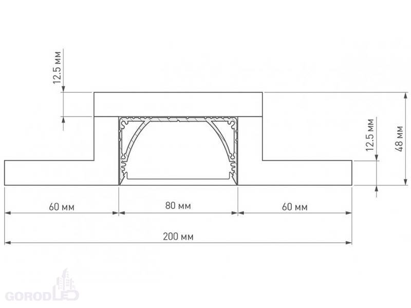 Размеры модуля: 2000 х 200 х 48 мм. Ширина площадки для ленты: 38,2 мм. Толщина гипсокартона: 12,5 мм.