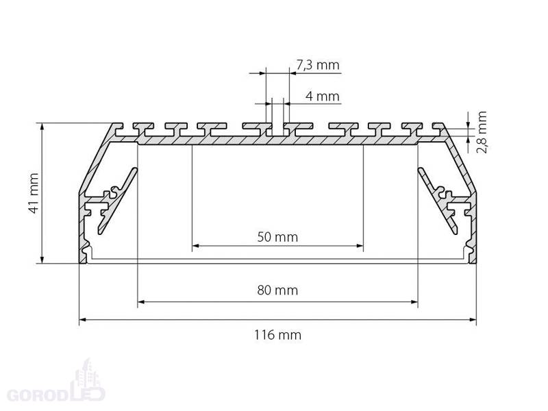 Габаритные размеры (L×W×H): 2000 x 116 x 41 мм. Ширина площадки для ленты 80 мм.