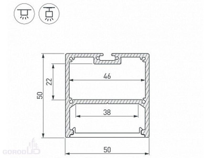Габаритные размеры (L×W×H): 2500 x 50 x 50 мм. Ширина площадки для ленты 38 мм. Отсек для БП 46 х 22 мм.