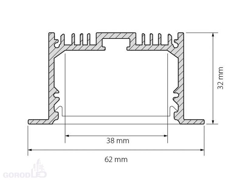 Габаритные размеры (L×W×H): 2500 x 62 x 32 мм, паз для установки 49 мм. Ширина площадки для ленты 38 мм.