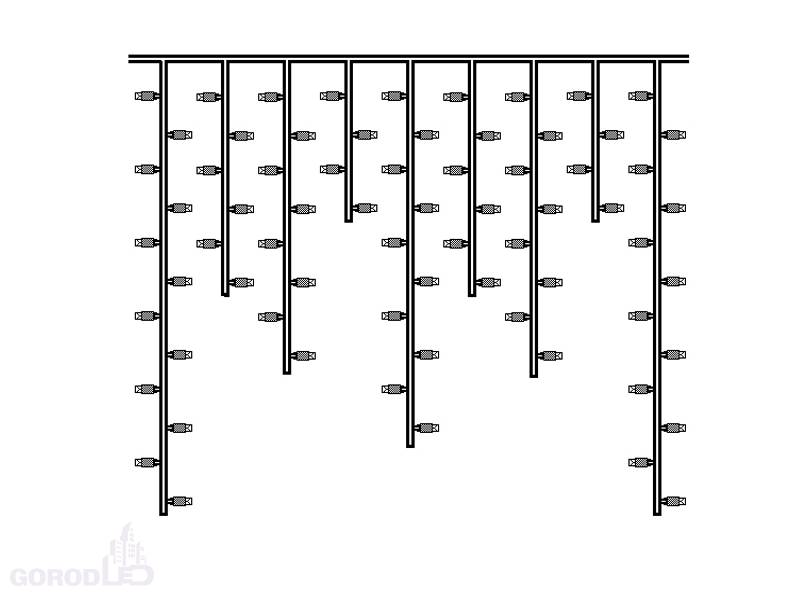 Светодиодная бахрома 3,2х0,9 представляет собой 3,2 метровый шлейф, на котором располагаются нити разной длины до 0,9 метров, общее количество 232 светодиодов (led). На концах шлейфа расположены коннекторы для последовательного соединения.
