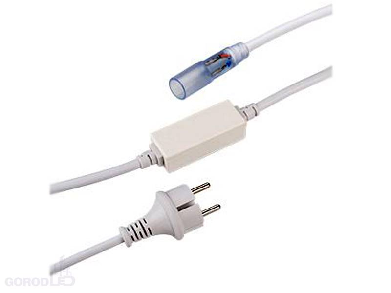 Провод питания для двухпроводного светодиодного дюралайта. Материал оболочки каучук. В комплект входит: провод питания с вилкой европейского стандарта, разъём подключения к дюралайту, выпрямитель AC/DC. Длина провода 1.5 метра.