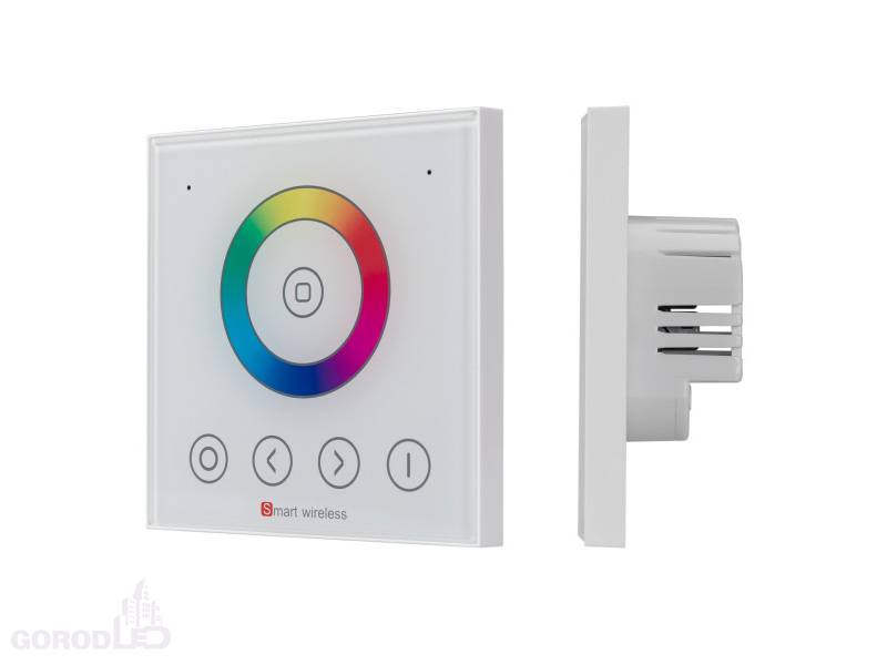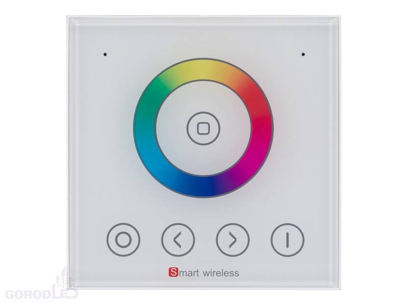 Встраиваемая сенсорная панель (Европейский стандарт) для управления RGB светодиодными лентами, цвет белый. 3 канала, питание DC 12-24V, ток нагрузки 3x4A, мощность нагрузки 144-288W. Габариты 89 х 89 х 40 мм.