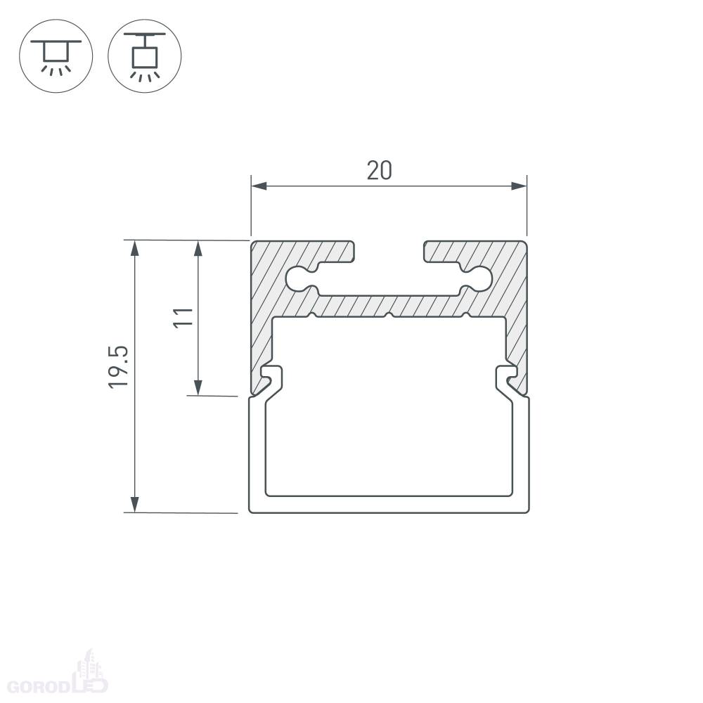 Габаритные размеры (L×W×H): 2500 x 20 x 20 мм. Ширина площадки для ленты 16,5 мм.