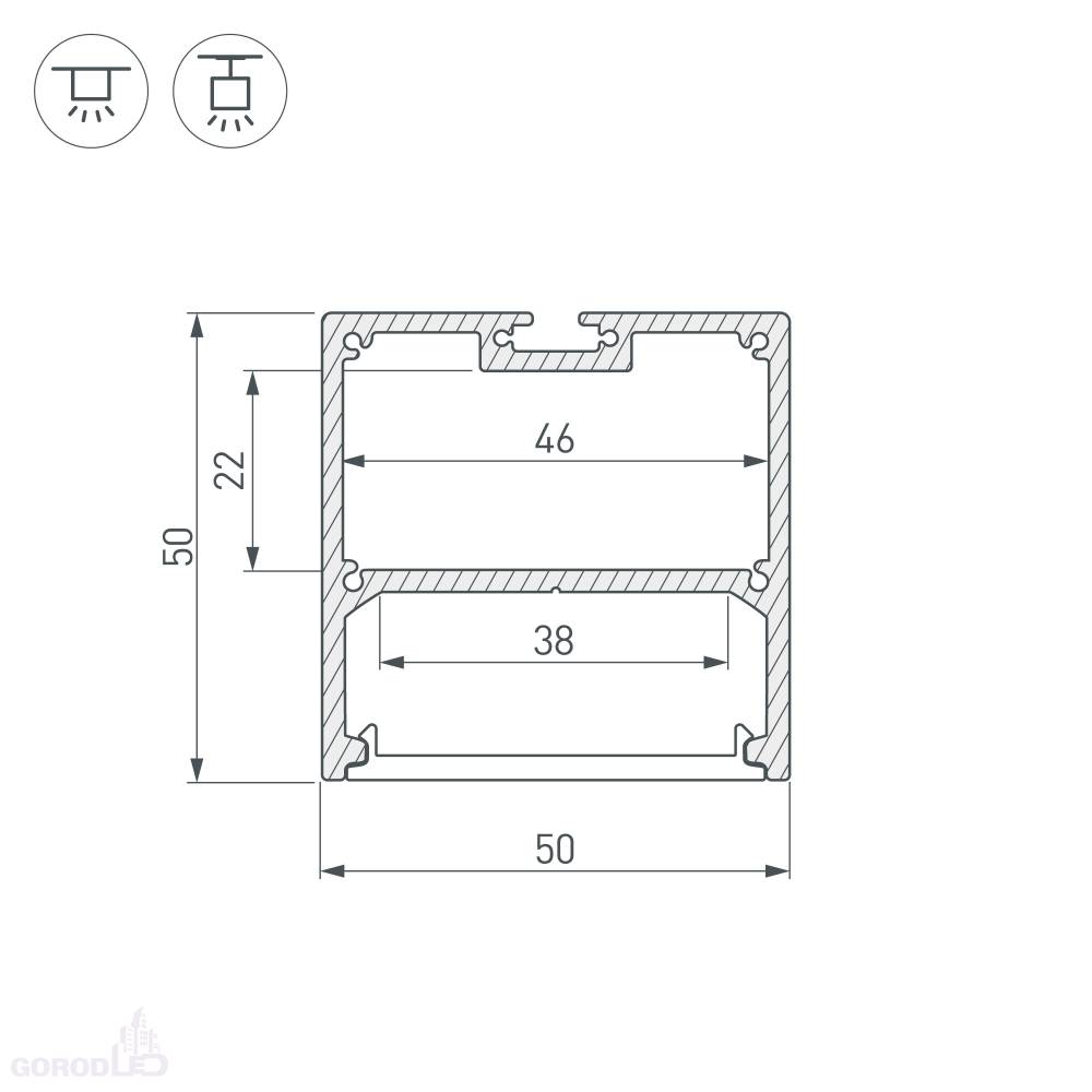 Алюминиевый анодированный подвесной профиль для светодиодных лент и линеек, с отсеком для блока питания (размер отсека 20 х 32 мм).
