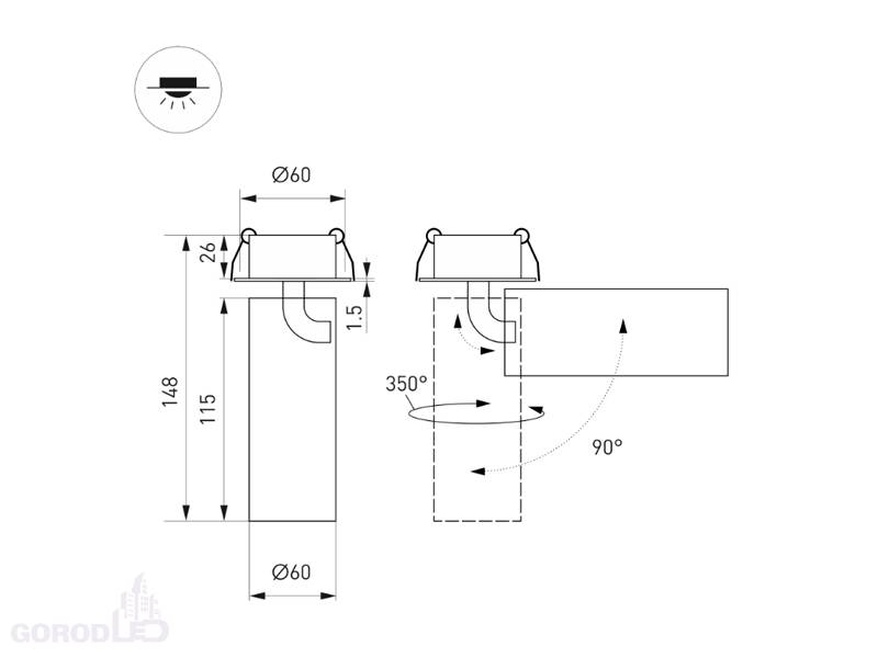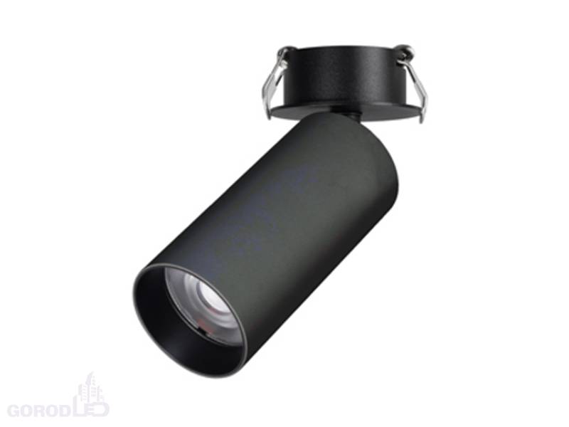 Светильник встраиваемый откидной. Мощность 12 Вт, св. поток 1100 лм, 92 лм/Вт, теплый 3000 K, дневной 4000 К, CRI>90, угол 36°, напряжение питания 230 В. Белый или черный круглый корпус из алюминия, экран PMMA, степень защиты IP40. Размер: диаметр 60 мм, высота светового модуля 115 мм, высота основания 1,5 мм. Угол поворота 350°, угол наклона 90°. Монтаж встраиваемый, установочное отверстие: диаметр 55 мм, глубина 26 мм. Драйвер в комплекте 24-42 В, 300 мA, пульсация <1%.