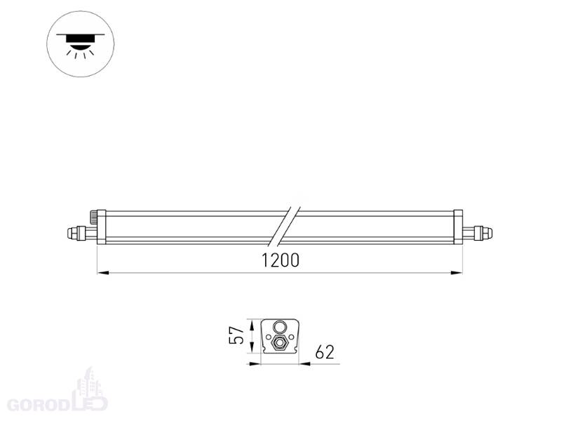 Накладной светильник 28 Вт. со встроенным микроволновым датчиком движения. Цвет БЕЛЫЙ ДНЕВНОЙ 4000K, св.поток 3680лм, CRI(Ra)>80, угол свечения 120°. Корпус прямоугольный, белый пластик, влагозащищенный IP65. Ударопрочность IK05. Размер LxWxH 1200x62x57мм. Питание AC 220-240В, 28 Вт, драйвер встроенный. Максимальная мощность для подключения в линию 300 Вт. Настройки датчика: Дальность действия 10,5м. Время отключения 5сек.