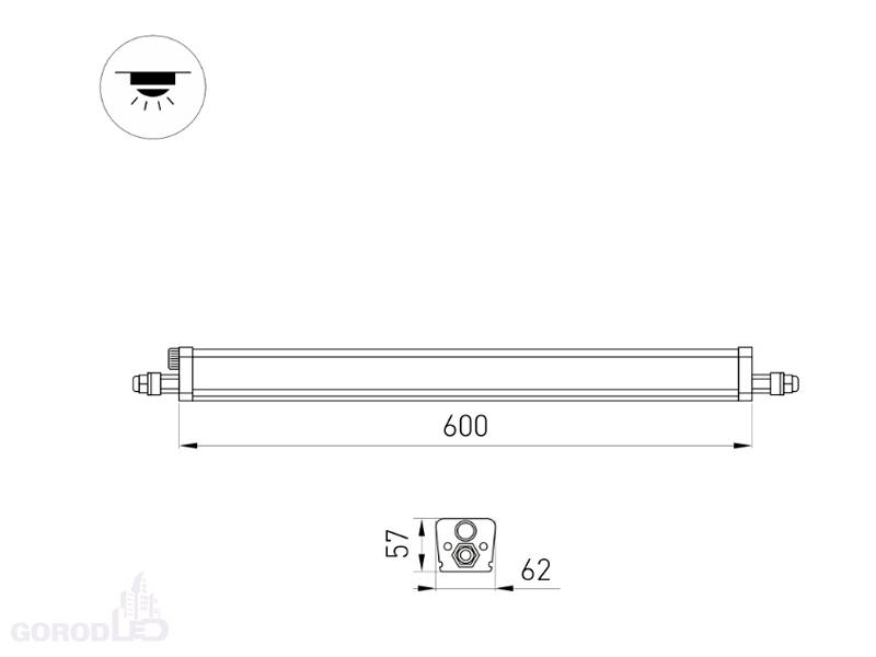 Накладной светильник 14 Вт со встроенным микроволновым датчиком движения. Цвет БЕЛЫЙ ДНЕВНОЙ 4000K, св.поток 1820лм, CRI(Ra)>80, угол свечения 120°. Корпус прямоугольный, белый пластик, влагозащищенный IP65. Ударопрочность IK05. Размер LxWxH 600x62x57мм. Питание AC 200-240В, 14 Вт, драйвер встроенный. Максимальная мощность для подключения в линию 300 Вт. Настройки датчика: Дальность действия 10,5м. Время отключения 5сек.