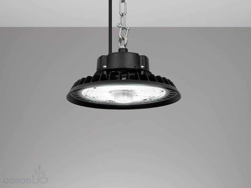 Светильник для освещения складских и промышленных помещений. Мощность 200W, напряжение питания AC 120-270V/50Hz. CRI 80. Тип светодиодов SMD2835, с групповой оптической линзой. Цвет свечения ДНЕВНОЙ 5000K, световой поток 30000 Lm, угол рассеивания 90°. Доступно управление по протоколу 0-10В. Цвет корпуса черный, линза из поликарбоната, степень влагозащиты IP65, ударопрочность IK08. Габариты Ф350xH140мм. Рым-болт в комплекте. Датчик настраивается с помощью пульта 052018 (один на все датчики).