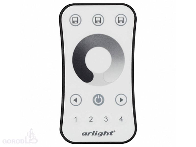 Кнопочный радиопульт с сенсорным кольцом 2.4 ГГц белого цвета для управления одноцветным (DIM) источником света. 4 зоны управления, управление яркостью с помощью сенсорного кольца. Питание 3VDC (CR2032). Габариты 107 x 58.5 x 9 мм. Управляет контроллерами и панелями серии SMART (поставляются отдельно).