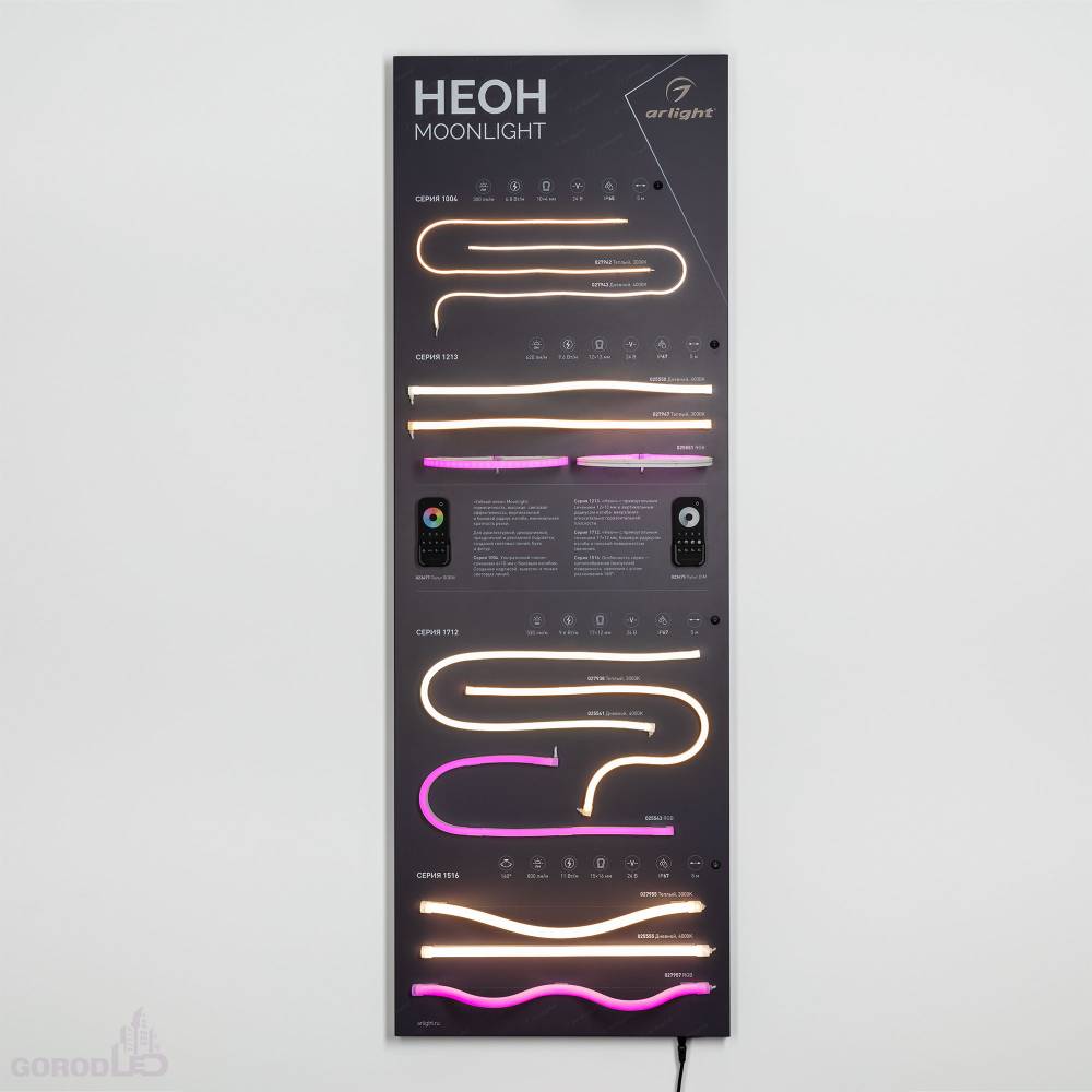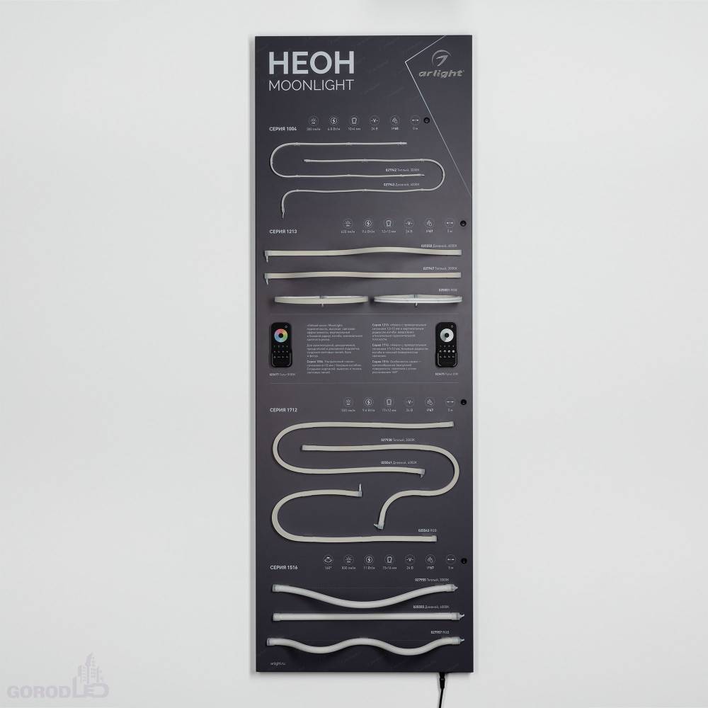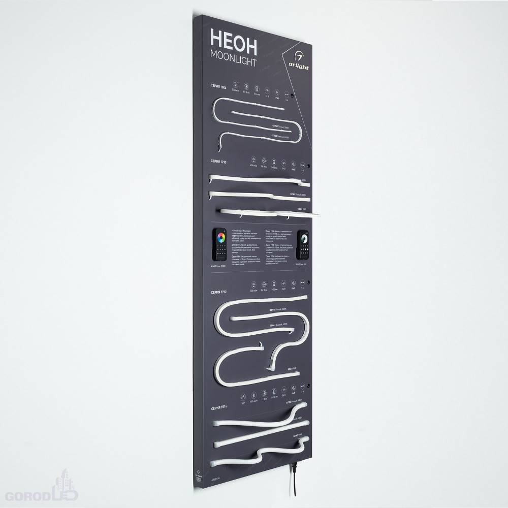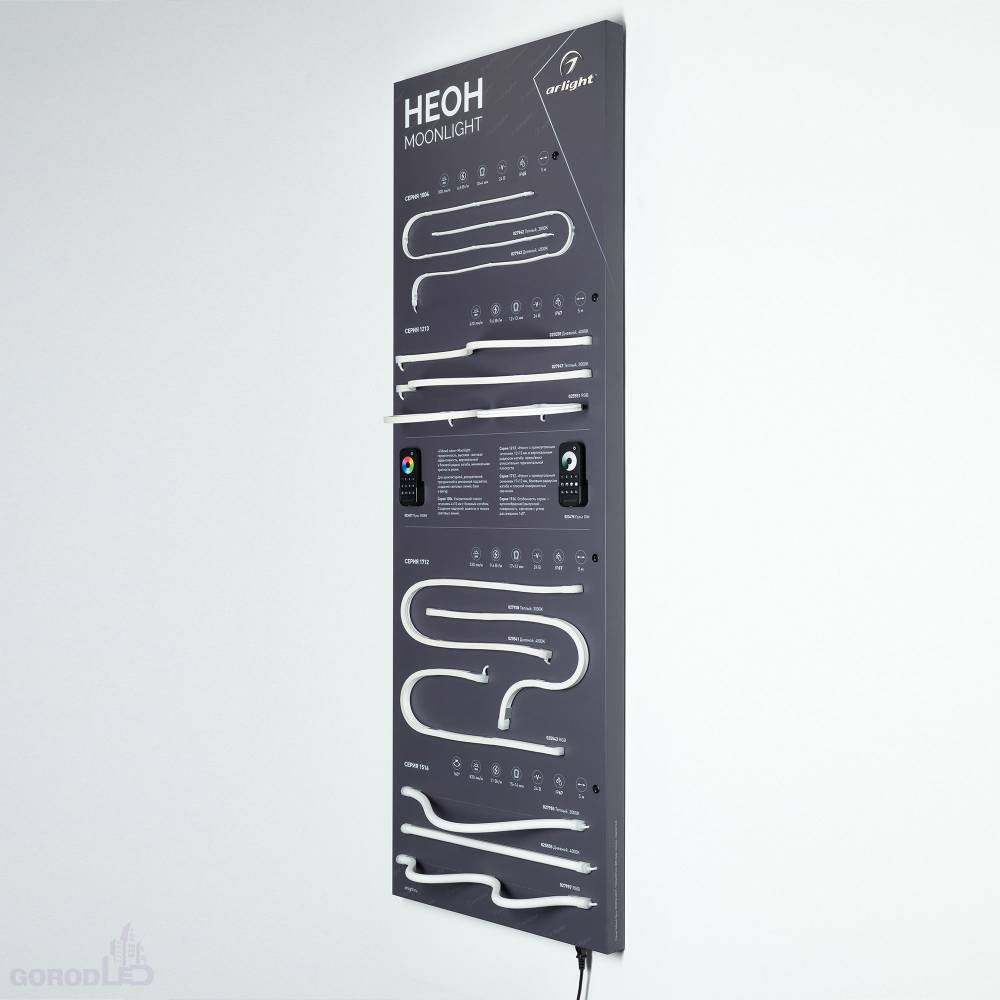 Стенд Гибкий Неон MOONLIGHT. Материал - композит 3 мм, пленка, печать. Габаритные размеры (Ширина Х Высота Х Глубина), 600х1760х60 мм. Питание 230 В.