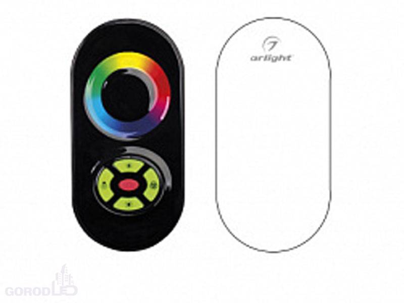 RGB-контроллер (овальный черный радиопульт с 5 кнопками и сенсорным кольцом) Выбор цвета с помощью сенсор. кольца, прямой выбор белого цвета, 12-24V, 180/360W, 5A/канал. 85 х 65 х 24 мм.